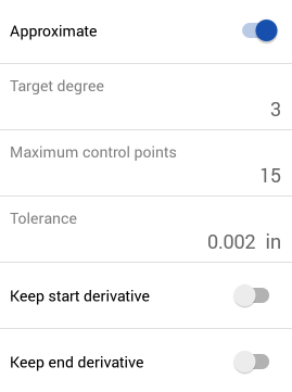 Check Approximate to reapproximate the curve. This rebuilds the curve to a new mathematical specification. Set the Target degree, Maximum number of control points, and Tolerance. Check Keep start derivative and Keep end derivative to preserve the curve’s tangency at both ends of the curve.