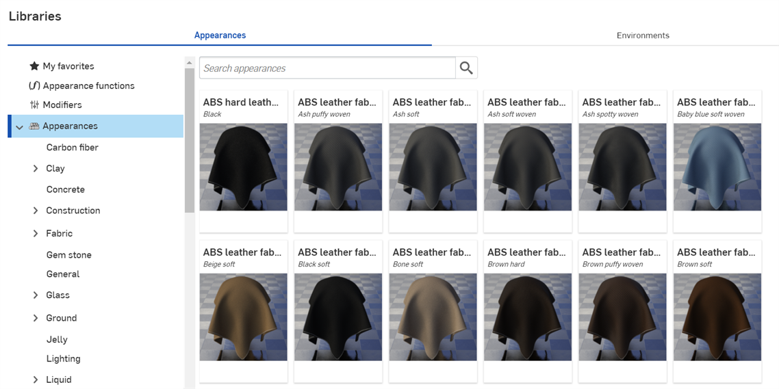 Die Aussehen-Bibliothek am Ende der Seite enthält alle Standard-Attributkombinationen, die auf Bauteile, Bauteilflächen oder Oberflächen angewendet werden, um eine Materialtextur zu erzeugen, sowie Funktionen, die auf Aussehen-Parameter angewendet werden: