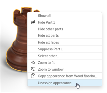 Es gibt sechs Möglichkeiten, einem Szenenelement ein Aussehen zuzuweisen (Render Studio, Part Studio, Baugruppe, Bauteil oder Fläche). Führen Sie einen der folgenden Schritte aus:
