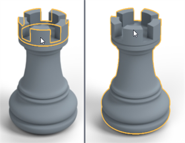 Im folgenden Beispiel wird der äußeren Kronenfläche des Turmmodells ein Aussehen aus gebürstetem Metall zugewiesen. Anschließend wird dem gesamten Turmteil ein blaues keramisches Aussehen zugewiesen. Wenn Sie X drücken, um die Nachricht „Flächenaussehen löschen“ zu schließen, wird das blaue keramische Aussehen auf alle Bauteilflächen angewendet, mit Ausnahme der äußeren Kronenfläche, auf der das Aussehen des gebürsteten Metalls erhalten blieb (siehe unten links). Wenn Sie alternativ auf den Link „ Flächen löschen“ klicken, wird das Aussehen des gebürsteten Metalls von der äußeren Kronenfläche entfernt (entfernt) und auf das Teil (und alle darunter liegenden Bauteilflächen) wird das blaue keramische Aussehen angewendet (siehe unten rechts):