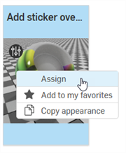 Suchen Sie in der Aussehen-Bibliothek nach einem Aufkleber, klicken Sie dann mit der rechten Maustaste auf die Miniaturansicht „Aufkleber-Überlagerung hinzufügen“ und wählen Sie im Kontextmenü die Option Zuweisen aus: