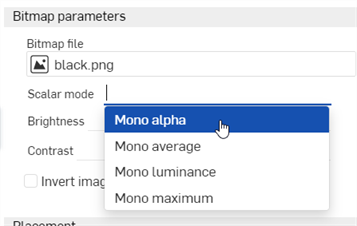 Wählen Sie im Dropdown-Menü für den Skalarmodus im Untermenü „Bitmap-Parameter“ die Option Mono-Alpha aus: