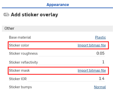 Um die Aufkleber- und/oder Maskeneinstellungen zu ändern, klicken Sie in der Aufkleberfarbe bzw. in der Aufklebermaske auf den Link Bitmap-Datei importieren und passen Sie dann die Einstellungen an. Damit sowohl der Aufkleber als auch die Maske synchron bleiben, müssen beide Einstellungssätze aktualisiert werden, damit sie übereinstimmen:
