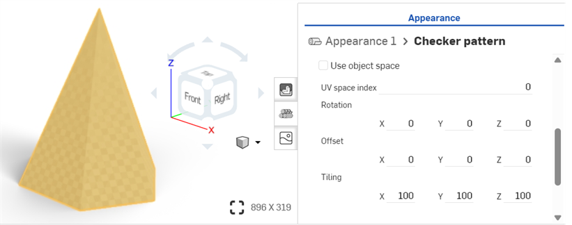 Wenn das Aussehen ein Muster oder eine Textur enthält, die nicht auf dem Bauteil angezeigt wird, ist es möglicherweise zu klein oder zu groß. Erhöhen oder verringern Sie in der Aussehen-Palette den Parameter „Skalierung“. Versuchen Sie außerdem, den Parameter „Intensität“ zu erhöhen, falls er vorhanden ist.