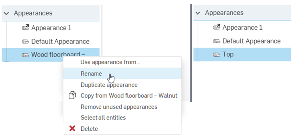 Wenn ein Aussehen einem Bauteil nicht zugewiesen werden kann (die Optionen des Kontextmenüs sind nicht verfügbar oder werden nicht angezeigt, wenn ein Aussehen per Drag-und-Drop auf ein Bauteil angewendet wird), bedeutet dies wahrscheinlich, dass das Aussehen eine Funktion ist. Funktionen müssen auf Aussehen-Parameter in der Aussehen-Palette angewendet werden (durch Drag-und-Drop). Weitere Informationen finden Sie unter Aussehen-Funktionen verwenden.