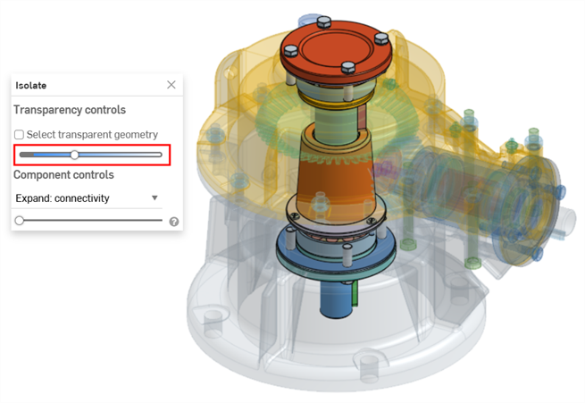 Expandir: conectividad (solo en Ensamblajes): utilice el control deslizante para aislar cada instancia sucesiva en función de su conectividad de relación. Mover el control deslizante hacia la derecha hace que más instancias dejen de ser transparentes (opacas).