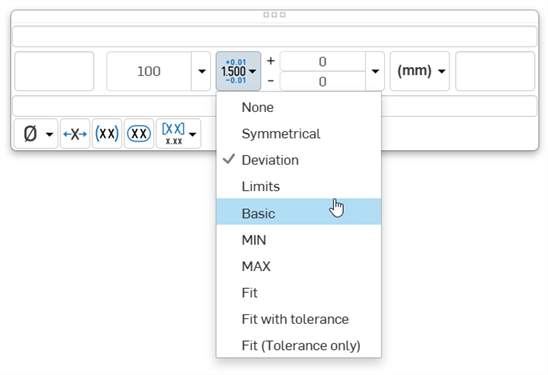 - Tolerance - Select None, Symmetrical, Deviation, Limits, Basic, MIN, MAX, Fit, Fit with tolerance, or Fit (Tolerance only).