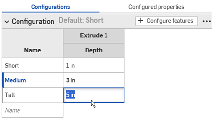 - 最初の行をクリックしてアクティブ化し、最初の列に入力値の名前を入力します。タブを押します 次の行に移動します。行の左側にある青いバーは、Part Studio で現在選択されているコンフィギュレーションを示します。
