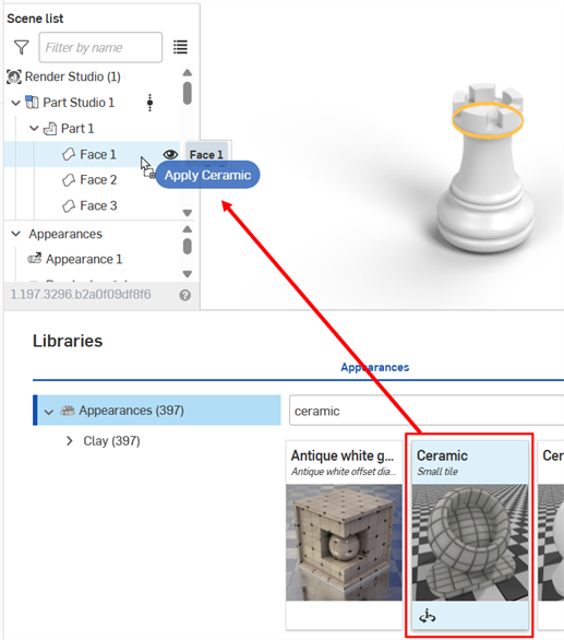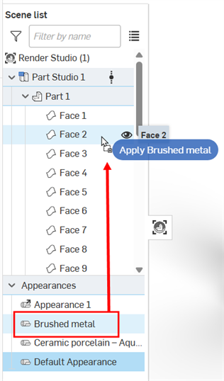 外観ライブラリから、シーンリストのエンティティ (Render Studio、Part Studio、アセンブリ、パーツ、または面) にドラッグアンドドロップします。