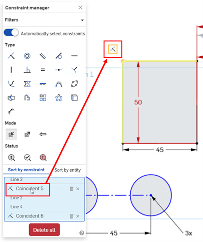 - 구속 조건 삭제: 단일 구속 조건 아이콘을 클릭하고 삭제를 클릭하거나 컨텍스트 메뉴에서 삭제를 선택합니다.